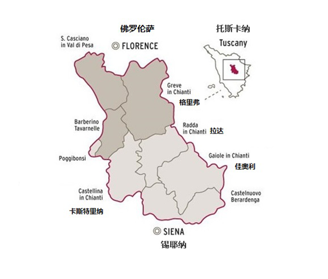 經(jīng)典基安帝產(chǎn)區(qū)地處托斯卡納(Tuscany)大區(qū)中部的佛羅倫薩市(Florence)與錫耶納市(Siena)之間,總占地7萬余公頃,在行政區(qū)域上涉及9個市鎮(zhèn),涵蓋了拉達(dá)(Radda in Chianti)、佳奧利(Gaiole in Chianti)、卡斯特里納(Castellina in Chianti)和格里弗(Greve in Chianti)這四個市鎮(zhèn)的全部地域以及其余5個市鎮(zhèn)的部分地域。