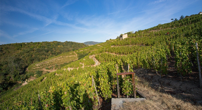孔得里約以大陸性氣候為主,也會受到一些地中海氣候的影響,夏季炎熱。葡萄園主要分布在朝南或東南的陡峭階地上,這里光照充足,通風(fēng)條件好,有助于葡萄藤健康生長,免受病蟲害的影響,南或東南的朝向也可以保護(hù)葡萄藤在開花期免受寒冷北風(fēng)密斯托拉風(fēng)(Mistral)的摧毀。