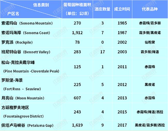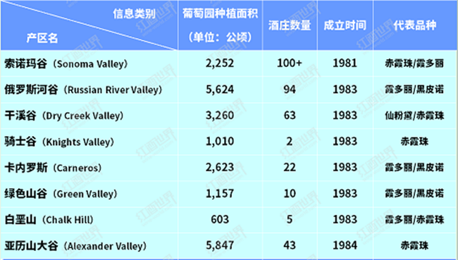 索諾瑪縣擁有多達17個AVA子產區,每個產區都擁有自己獨特的歷史、地理條件和代表品種,以下兩個表格是索諾瑪縣子產區的基本信息概況。