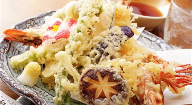 天婦羅是日本料理的代表食物之一,在原料上選擇繁多,大體上可分為蔬菜類(如蘆筍和洋蔥)、海鮮類(如大蝦)以及其他類(如饅頭和豆腐)。這些食材經(jīng)過腌制入味后掛糊,接著放入熱油中炸制。與中式油炸類美食的面衣不同,天婦羅的掛糊十分薄透,油炸的時(shí)間也十分短暫。天婦羅一般采用質(zhì)地較輕的菜籽油炸制,但有時(shí)也會(huì)選擇質(zhì)地較為厚重的芝麻油,出鍋后常搭配蘿卜泥以及松魚干汁、醬油和海米汁等醬汁食用。
