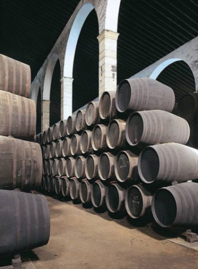 雪莉酒的強(qiáng)化發(fā)生在基酒發(fā)酵結(jié)束后,一般通過混入部分酒精濃度高達(dá)96%abv的蒸餾烈酒來將葡萄酒的酒精度提升至15-15.5%abv或17%abv。然后,酒液會轉(zhuǎn)入獨(dú)特的索萊拉(Solera)系統(tǒng)進(jìn)行熟化。這種系統(tǒng)的特點(diǎn)在于將不同熟化期的酒液分層存放,然后在熟成過程中每隔一段時間就將年輕酒液與熟化較久的酒液混合,以保證每次釀出的雪莉酒風(fēng)格一致,且品質(zhì)穩(wěn)定。雪莉酒的風(fēng)味大多源自該熟化階段,其風(fēng)格也與熟化時長和熟化方式等息息相關(guān)。