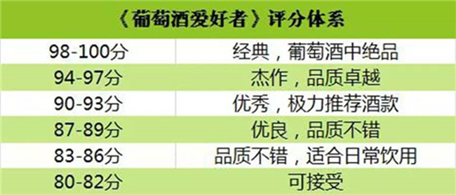 從上列表格中可以看出,這些評(píng)分體系的區(qū)間也不太相同,比如 82 分在《葡萄酒愛好者》評(píng)分體系中屬于可接受的品質(zhì),而在《葡萄酒觀察家》評(píng)分體系中卻代表優(yōu)良品質(zhì),再次說明不同評(píng)分體系給予的分?jǐn)?shù)不具有對(duì)比性。