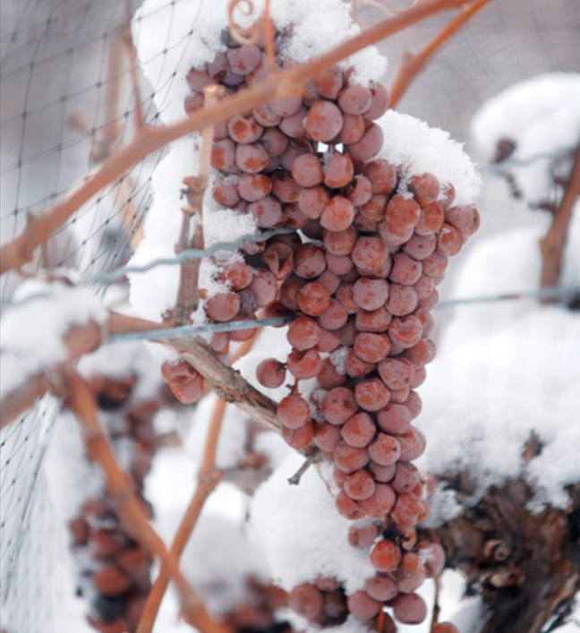 風(fēng)干葡萄將“濃縮就是精華”奉為真理,冰葡萄則用冰霜鎖住精華。在寒冷地區(qū),種植者們會將葡萄留于枝頭,成串結(jié)冰,直至嚴(yán)冬在夜間進(jìn)行采收。冰葡萄硬度大,壓榨時(shí)需要施加較大壓力,榨出來的葡萄原汁僅有正常收獲葡萄的五分之一,卻濃縮了很高的糖分、酸度和風(fēng)味物質(zhì)。最終的成酒沒有風(fēng)干葡萄酒那樣不加掩飾的奔放香氣與厚重酒體,而是以清潤甜美的風(fēng)格自成一派。