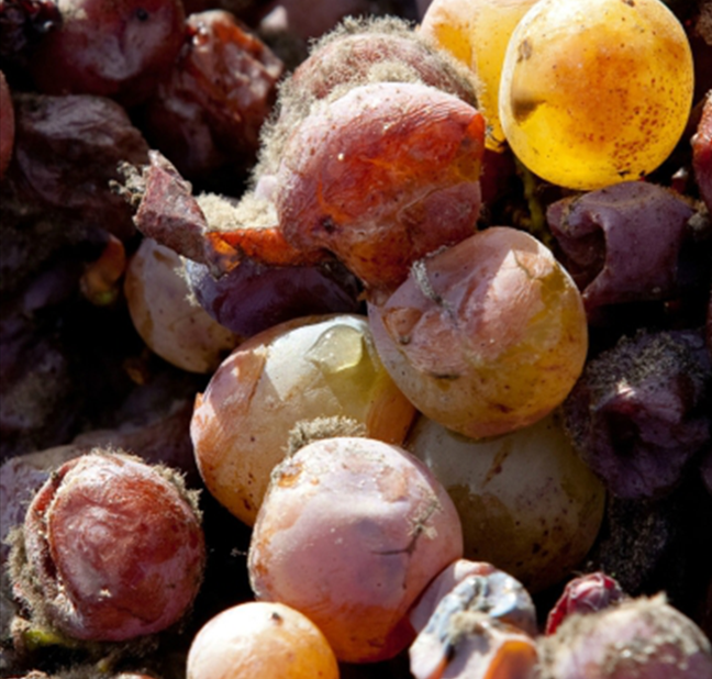 如圖所示,貴腐葡萄身形干癟,表皮還伴有細(xì)細(xì)的菌絲,若對該類葡萄沒有了解,定會認(rèn)為這是發(fā)了霉的爛葡萄,但到了葡萄農(nóng)這兒,它就是彌足珍貴的釀酒原料。要成為貴腐葡萄,被灰葡萄孢菌(Botrytis Cinerea)侵染是第一步,但灰葡萄孢菌“亦正亦邪”,在適當(dāng)條件下,它可以轉(zhuǎn)化為有益的貴腐菌(Noble Rot),反之則有可能化身為誘導(dǎo)果實(shí)腐爛變質(zhì)的灰腐菌(Grey Rot)。因此,健康果實(shí)感染灰葡萄孢菌的“造化”就全憑清晨是否潮濕多霧、午后是否晴朗干燥來決定了。成功被貴腐菌侵染的葡萄表皮穿孔、水分蒸發(fā),糖分、酸度以及風(fēng)味物質(zhì)高度濃縮,與風(fēng)干葡萄有著異曲同工之妙,卻比風(fēng)干葡萄產(chǎn)量更低、更加難能可貴。