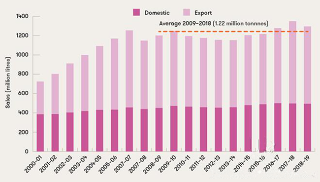 紅葡萄酒占總產(chǎn)量的57%,而上一年度為52%。雖然這部分與季節(jié)變化有關(guān),但也是對(duì)消費(fèi)者偏好變化的一種反應(yīng)。紅葡萄酒占出口銷售的60%,而在長(zhǎng)期以白葡萄酒為主的澳洲國(guó)內(nèi)市場(chǎng),澳大利亞紅葡萄酒的銷量在2018-19年度首次超過(guò)白葡萄酒。