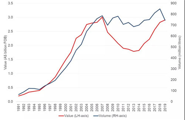 近日,澳大利亞葡萄酒管理局公布了最新出口報告。截至2019年12月底的12個月,澳大利亞葡萄酒對中國市場的出口總額及平均出口額雙雙創下年度新高。