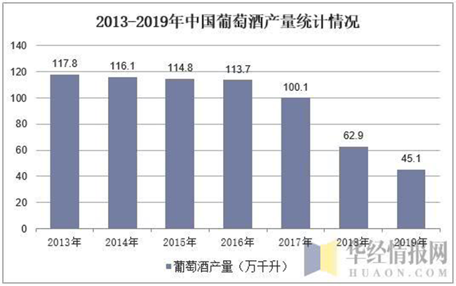 然而,目前中國的葡萄酒產(chǎn)業(yè)發(fā)展并不成熟,隨著我國國民生活質(zhì)量的提高,對高端葡萄酒需求增加,進(jìn)口葡萄酒快速蠶食國產(chǎn)葡萄酒市場份額,近年來中國葡萄酒產(chǎn)量持續(xù)下降,2019年中國葡萄酒產(chǎn)量達(dá)45.1萬千升,與2018年相比減少了17.8萬千升。