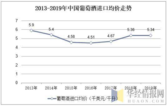 從進(jìn)口均價來看,近年來我國葡萄酒進(jìn)口均價基本維持在5千美元/千升,2015年葡萄酒進(jìn)口均價下降至5千美元/千升以下,2016年以后葡萄酒進(jìn)口價格又逐漸開始回升,據(jù)海關(guān)統(tǒng)計數(shù)據(jù)顯示,2019年國內(nèi)葡萄酒進(jìn)口均價為5.34千美元/千升,與2018年基本持平。