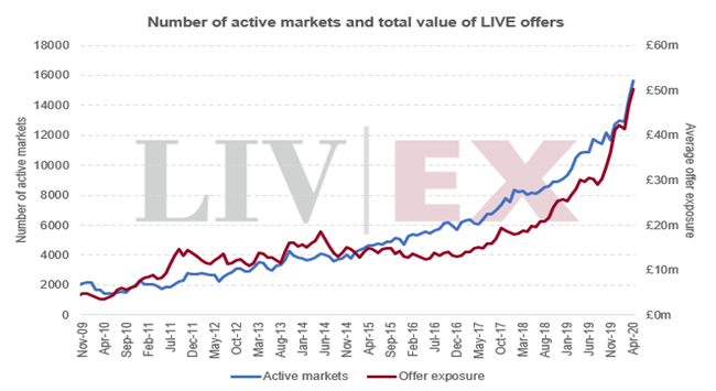 在冠狀病毒下,現在更多酒商遙距工作,商店、而飯店和旅館等傳統(tǒng)渠道也已關閉,這令Liv-ex平臺上的交易更加活躍。隨著提供選擇的葡萄酒類型不斷擴大,活躍市場(有出價或競價的葡萄酒(LWIN11))數量也已突破了15,500款!