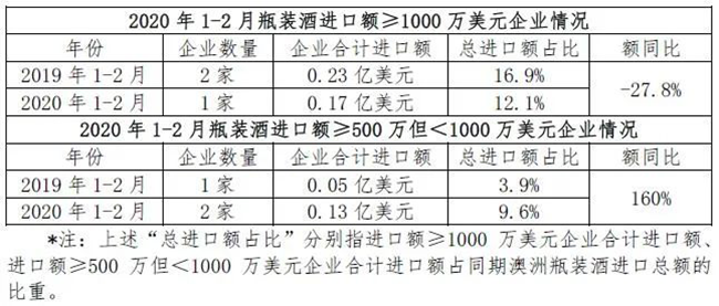今年1-2月,盡管疫情對行業有一定沖擊,但澳洲瓶裝酒進口頭部企業基本穩住陣腳。雖然進口額≥1000萬美元的企業僅1家,少于去年同期,但其進口額同比增長近30%;而進口額≥500萬但小于1000萬美元的企業有2家,數量增加,其中,1家進口額實現倍數增長,1家為新的行業進入者。