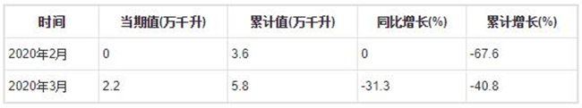 2020年3月全國葡萄酒產(chǎn)量為2.2萬千升,累計(jì)值為5.8萬千升,同比下降31.3%,累計(jì)下降40.8%。