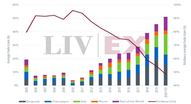 隨著市場繼續(xù)擴(kuò)大,波爾多的交易份額已跌至歷史新低的41%;勃艮第也跌至9.3%。 這進(jìn)一步證實(shí),買家的興趣已擴(kuò)展到這兩個高價值酒區(qū)之外。