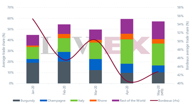 意大利成為了最耀眼的新星。上月,該酒區(qū)的交易份額升至22.5%的歷史新高;部分是由于免美國關(guān)稅、以及廣受好評的布魯諾Brunello ’15年和巴羅洛Barolo ’16的發(fā)布活動所推動。 羅納(5.2%)和“世界其它酒區(qū)”(13.3%)的交易份額也有增加。