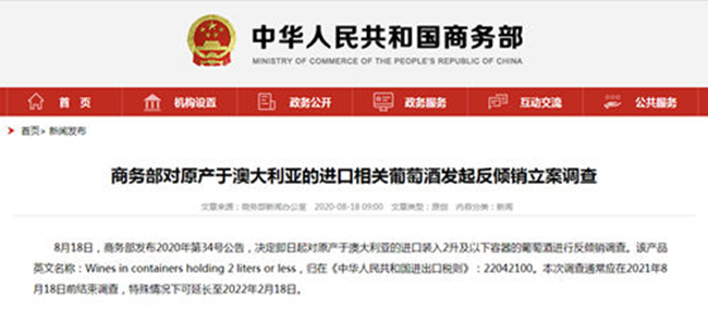 8月18日,商務部發布2020年第34號公告,決定即日起對原產于澳大利亞的進口裝入2升及以下容器的葡萄酒進行反傾銷調查。