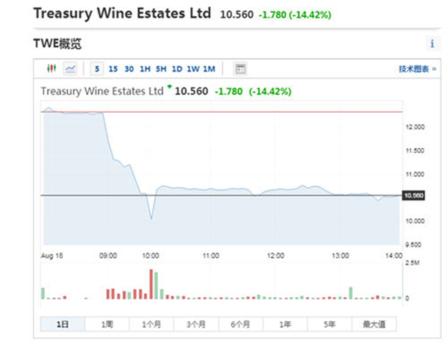 澳大利亞葡萄酒巨頭富邑葡萄酒集團(Treasury Wine Estates)發表聲明稱,將配合中國相關部門新宣布的對澳大利亞向中國出口葡萄酒的反傾銷調查。但僅在該聲明發表后不久,該企業股價便迎來斷崖式下跌,盤中股價一度跌至10.050澳幣,截止收盤,報10.560澳幣,下跌14.42%。