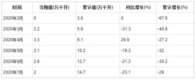 2020年7月全國葡萄酒產(chǎn)量為2萬千升,累計值為14.7萬千升,同比下降23.1%,累計下降29%。