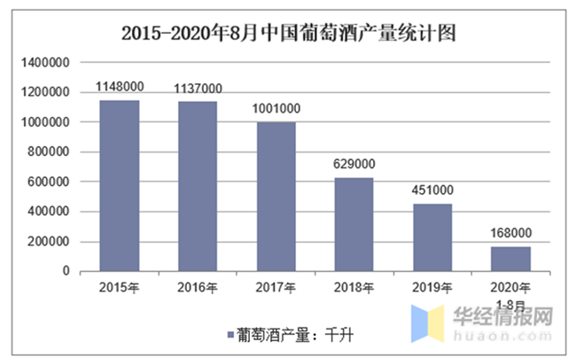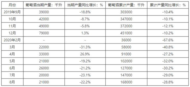 華經產業研究院數據顯示:2020年8月中國葡萄酒產量為21000千升,同比下降22.2%;2020年1-8月中國葡萄酒產量為168000千升,同比下降28.8%。