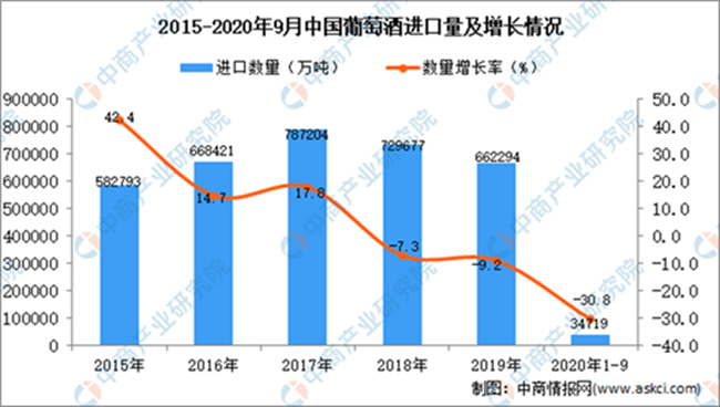 數2020年1-9月中國葡萄酒進口量及金額增長情況