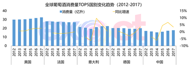 報告顯示,從2015年開始,中國葡萄酒消費(fèi)量持續(xù)增加,且增速保持在3.5%-6.8%。2017年,中國葡萄酒消費(fèi)量增加了0.6億升,全球占比7%,相比其他國家市場空間更大。