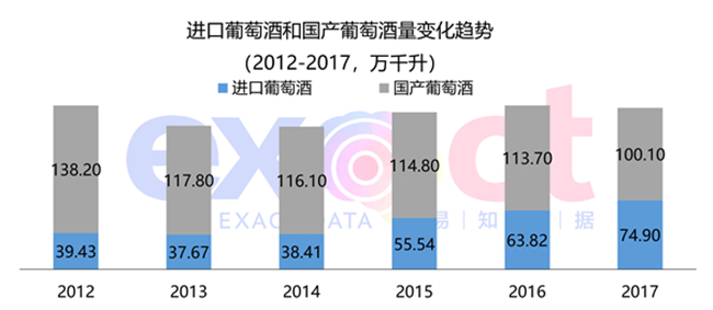 較之2013年,中國進(jìn)口葡萄酒總量5年內(nèi)翻了一番,2017年達(dá)到74.9萬升,增幅17.35%,而國產(chǎn)葡萄酒產(chǎn)量增速為 -11.95%。