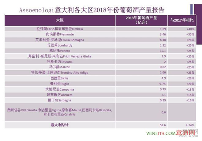 11月中旬,隨著意大利全境葡萄采摘季結(jié)束,意大利釀酒師及釀酒技術(shù)協(xié)會(Assoenologi)公布了關(guān)于2018年份意大利葡萄酒的產(chǎn)量報告。基于意大利農(nóng)業(yè)部的官方數(shù)據(jù),該報告做出結(jié)論:2018年,意大利葡萄酒及葡萄汁產(chǎn)量將比2017年份增長24%,將達到52.6億升。今年意大利葡萄酒產(chǎn)量的實際增幅超越了8月末曾發(fā)布的產(chǎn)量預(yù)告,整體形勢較為樂觀。