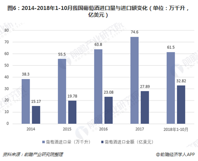 由下圖可見,隨著關(guān)稅降低,2014-2017年以來國內(nèi)葡萄酒進(jìn)口量和進(jìn)口金額逐年穩(wěn)步增長(zhǎng)。2018年前10月,葡萄酒進(jìn)口依舊活躍,進(jìn)口量達(dá)61.5萬千升,進(jìn)口額實(shí)現(xiàn)32.82億美元,與國內(nèi)疲軟的產(chǎn)量數(shù)據(jù)形成對(duì)比,反映出我國對(duì)葡萄酒的需求仍然較強(qiáng),且進(jìn)口葡萄酒的市場(chǎng)占有力已經(jīng)遠(yuǎn)超國產(chǎn)酒。