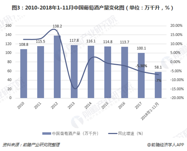 我國葡萄酒產(chǎn)量從2012年達(dá)到138.2萬千升的歷史高峰開始,一直在緩慢連續(xù)滑坡。根據(jù)國家統(tǒng)計(jì)局?jǐn)?shù)據(jù),2017年,全國葡萄酒產(chǎn)量100.1萬千升,累計(jì)下降5.3%;2018年1-11月,全國葡萄酒產(chǎn)量達(dá)58.1萬千升,累計(jì)下滑7%,若要趕超上年產(chǎn)量,12月的產(chǎn)量至少要達(dá)到42萬千升,而此數(shù)字比2018年前8個(gè)月的產(chǎn)量之和還多。結(jié)合目前數(shù)據(jù)看來,2018年國產(chǎn)葡萄酒產(chǎn)量大幅下滑已成定勢(shì)。