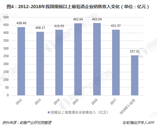 2018年前10月,我國規(guī)模以上葡萄酒企業(yè)銷售額為257.31億元,較上年同期下滑6.79%。進(jìn)入2018年,進(jìn)口葡萄酒大量涌入加上進(jìn)口葡萄酒產(chǎn)品價(jià)格區(qū)間進(jìn)一步下移,導(dǎo)致國內(nèi)葡萄酒市場(chǎng)尤其是中低價(jià)位葡萄酒市場(chǎng)競(jìng)爭(zhēng)十分激烈。
