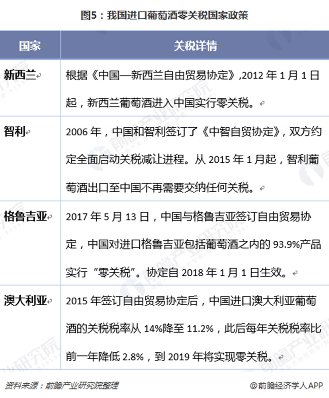 我國分別于2012年和2015年先后對(duì)新西蘭和智利進(jìn)口葡萄酒實(shí)施零關(guān)稅,僅需繳納消費(fèi)稅10%和增值稅16%。2018年起格魯吉亞進(jìn)口葡萄酒也加入零關(guān)稅隊(duì)伍。根據(jù)中澳自貿(mào)協(xié)定,至2019年,我國進(jìn)口澳大利亞葡萄酒的關(guān)稅將逐年降至零。關(guān)稅下行,不僅刺激著中國進(jìn)口葡萄酒市場(chǎng)的發(fā)展,使進(jìn)口葡萄酒的競(jìng)爭(zhēng)進(jìn)入白熱化階段,對(duì)中國國產(chǎn)葡萄酒市場(chǎng)份額的擠壓也是無可避免。