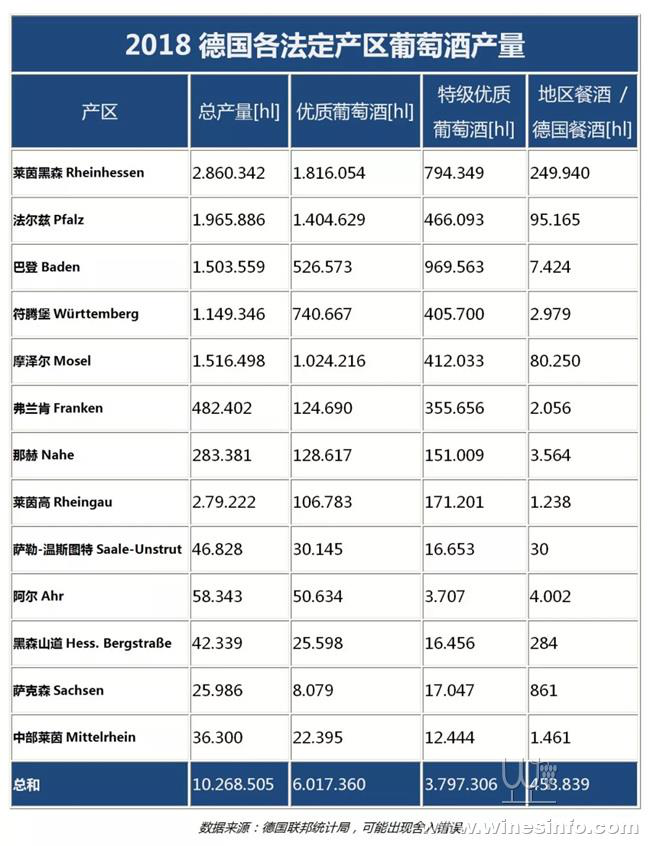 萊茵黑森的葡萄酒產量為2.86億升,是所有法定產區里最高的,法爾茲次之,為2.48億升。而巴登和符騰堡也分別收獲了1.5和1.15億升,突破了億升大關。摩澤爾收獲了近9千萬升葡萄酒,弗蘭肯為4.82千萬升,那赫為3.87千萬升,萊茵高為2.79千萬升。地區餐酒和德國餐酒的產量是4.54千萬升。