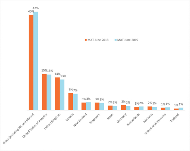 澳大利亞葡萄酒在中國表現(xiàn)非常良好。回顧2019年的前5個月,澳大利亞在進口額上成為中國大陸排名第一的葡萄酒進口來源國。同時,在全球葡萄酒進口市場總量下挫22%的情況下,澳大利亞葡萄酒在中國大陸的表現(xiàn)依然強勢,其市場份額相比于2015年增長了13%,達到了進口總量的24%。澳大利亞鞏固了其作為中國市場優(yōu)質(zhì)葡萄酒主要供應商的顯赫地位。