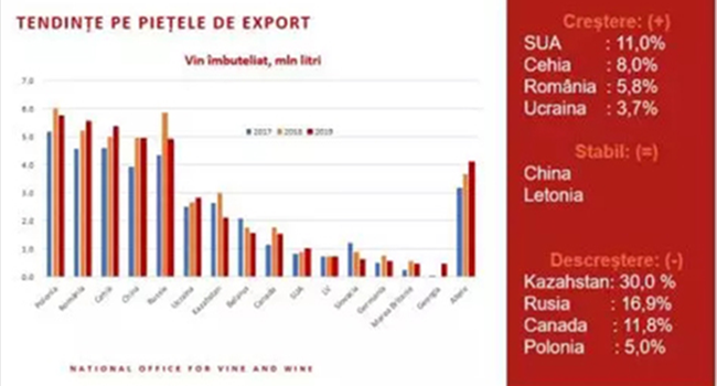 瓶裝葡萄酒的出口總值為13.76億列伊,與2018年指標持平,而散裝葡萄酒的出口總值下滑至 9.76億列伊(-3.6%)。葡萄酒出口總值為23.52億列伊(-1.9%)。