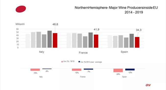 OIV工作人員對媒體表示,2019年全球葡萄酒減產(chǎn)的主因是“氣候災(zāi)害”。很多產(chǎn)區(qū)經(jīng)歷了寒冷多雨的春天與極度炎熱干燥的夏天,葡萄產(chǎn)量減少。