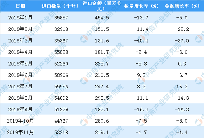 6. 2019年1-11月中國葡萄酒進口量同比下降10.6%