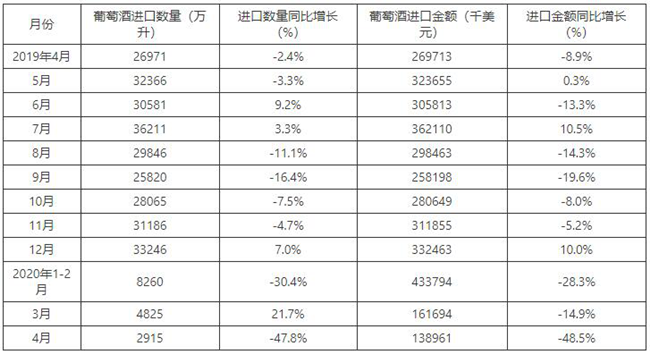2020年1-4月中國(guó)葡萄酒進(jìn)口數(shù)量、進(jìn)口金額及進(jìn)口均價(jià)統(tǒng)計(jì)