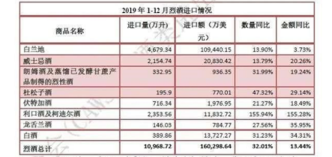 2月25日,中國(guó)食品土畜進(jìn)出口商會(huì)酒類(lèi)進(jìn)出口商分會(huì)發(fā)布《2019年全年酒類(lèi)進(jìn)口數(shù)據(jù)》。數(shù)據(jù)顯示,019年1-12月,烈酒進(jìn)口量1.1億升,同比增長(zhǎng)32%;進(jìn)口額16.億美元,同比增長(zhǎng)13.4%。烈酒在過(guò)去的一年里,一路逆市飄紅,統(tǒng)計(jì)在內(nèi)的各烈酒酒種全部實(shí)現(xiàn)量額齊增。