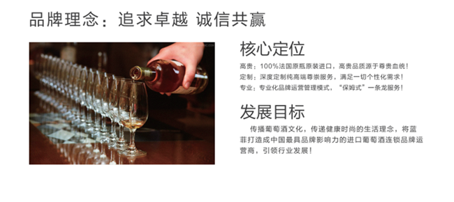 藍菲用十二年的經(jīng)驗,打造了獨一無二的品牌體系和運營體系,在十二年的時間里一直秉持“追求卓越、誠信共贏” 的經(jīng)營理念和服務(wù)宗旨,以客戶為中心、以市場為導(dǎo)向,致力于打造中國最有品牌影響力的進口紅酒連鎖品牌。